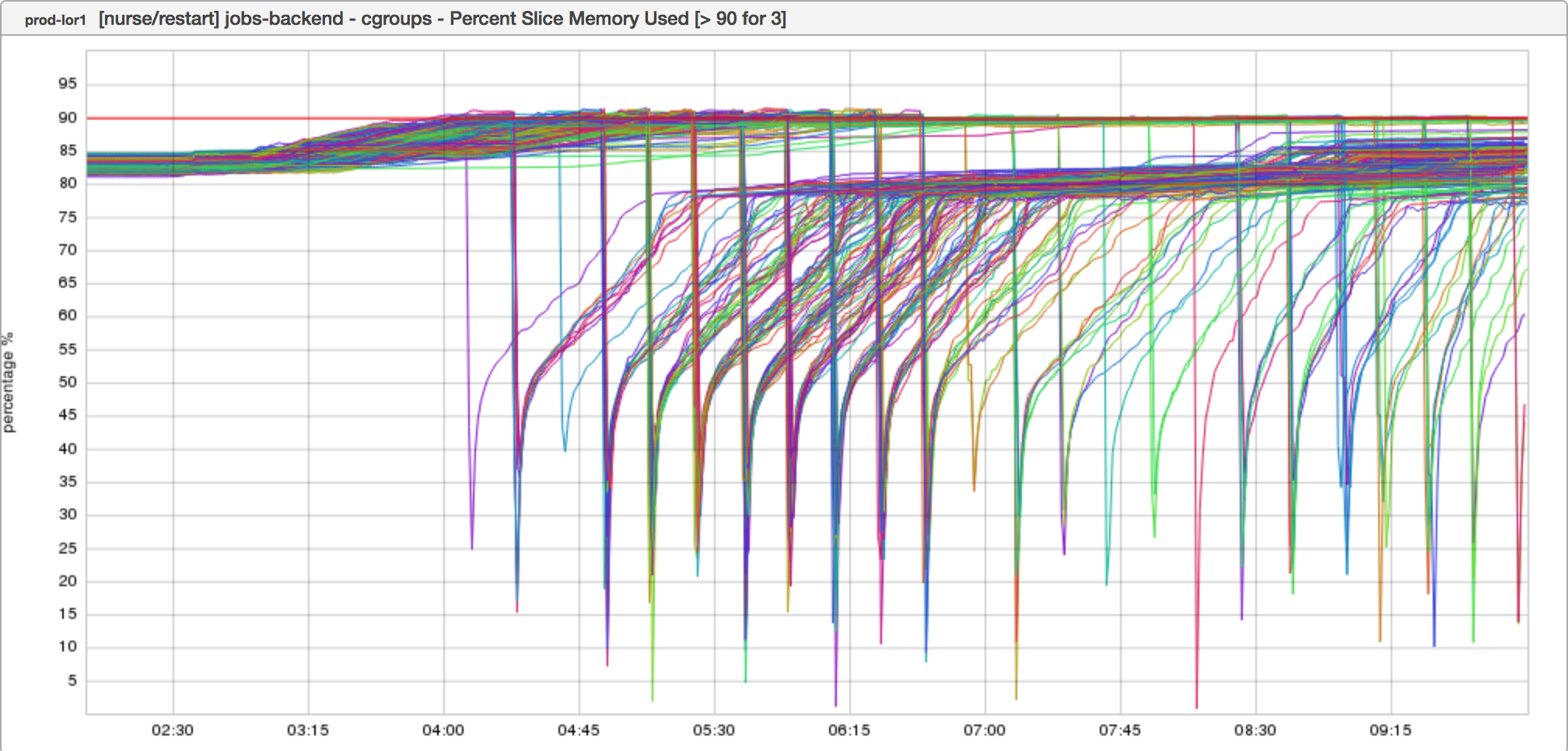 The unit - the vertical scale - is expressed as a percentage There is a thin red line at “90”, which in inGraphs denotes an alerting threshold The graph title is a bit opaque, but indicates that the inGraph has to do with “Memory Used” Also opaque, but I assume the “[>90 for 3]” describes the alerting criteria - i.e., “if at least 3 nodes go over 90% memory used then fire an alert”