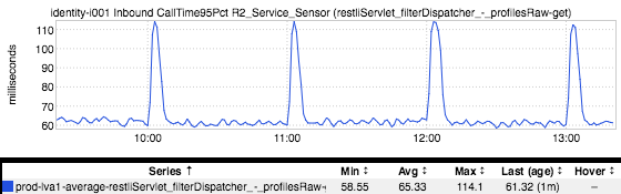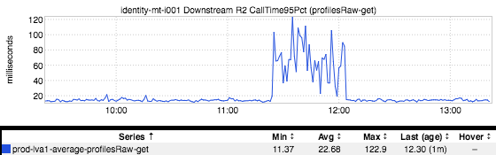 Hmmm…a whole bunch of nodes are seeing that additional latency and it’s actually worse than we’d thought wrt magnitude (look at the scale); not terribly surprising when you torture statistics by doing something like averaging per-host 95th percentile values. Where do we go from here? SOP: Take a look at the metrics for the downstream service that’s serving that endpoint: