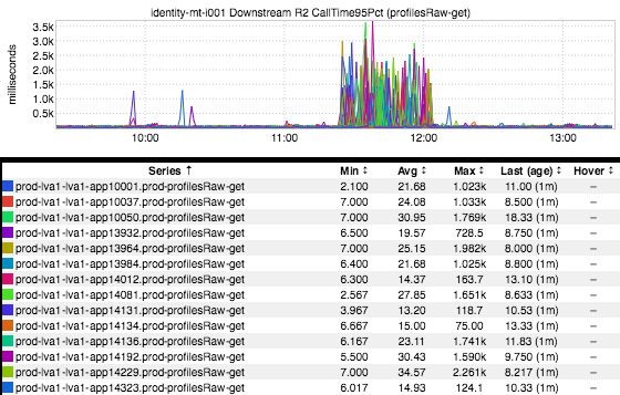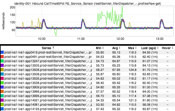 Well, okay. This inGraph shows the average of a bunch of nodes’ 95th percentile latencies. Averaging percentile values makes the Baby Jesus cry, so let’s remove that averaging function and take a look at each individual host’s latency.