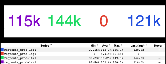 - title: main partition requests per fabric defs: - range: “%%pop-l0proxy” rrd: ats/plugin.stickyrouting.requests_routed_to_prod-lor1_count.rrd label: requests_prod-lor1 - range: “%%pop-l0proxy” rrd: ats/plugin.stickyrouting.requests_routed_to_prod-lsg1_count.rrd label: requests_prod-lsg1 - range: “%%pop-l0proxy” rrd: ats/plugin.stickyrouting.requests_routed_to_prod-ltx1_count.rrd label: requests_prod-ltx1 - range: “%%pop-l0proxy” rrd: ats/plugin.stickyrouting.requests_routed_to_prod-lva1_count.rrd label: requests_prod-lva1 params: label_trim: true multifabric: true stack: true lower_limit: 0 consolidate: Aggregate vlabel: requests/second notes: “Requests per fabric for main partition only, as seen by L0\n” raw-title: main partition requests per fabric RPN: - label: lor1 expression: “requests_prod-lor1,SUM” - label: lva1 expression: “requests_prod-lva1,SUM” - label: ltx1 expression: “requests_prod-ltx1,SUM” - label: lsg1 expression: “requests_prod-lsg1,SUM”