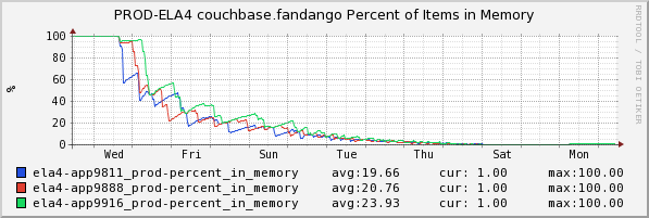 This represents the percentage of records that this couchbase has in memory. If you’re using couchbase as a cache you typically want this to remain at 100%, since as I mentioned you start taking a performance hit as records get ejected to disk. Note it starts off at 100% and then over time falls off until it eventually bottoms out at 0% (every record has been ejected). Also worth noting, couchbase has a certain amount of metadata per record that it must keep in RAM (i.e., that it cannot flush to disk) so after some amount of time it will run out of RAM for storing metadata and fall over entirely.