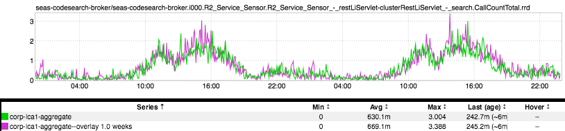 This is a couple of days’ worth of QPS to code search. If you play around with the timeline the regular patterns apply - down on nights & weekends, up during business hours, etc. What Juan wanted to point out: take a look at the noon hour, aka Lunch Time. I know this is only 2 days (plus WoW overlay), but the lunch hour shows a consistent dip.