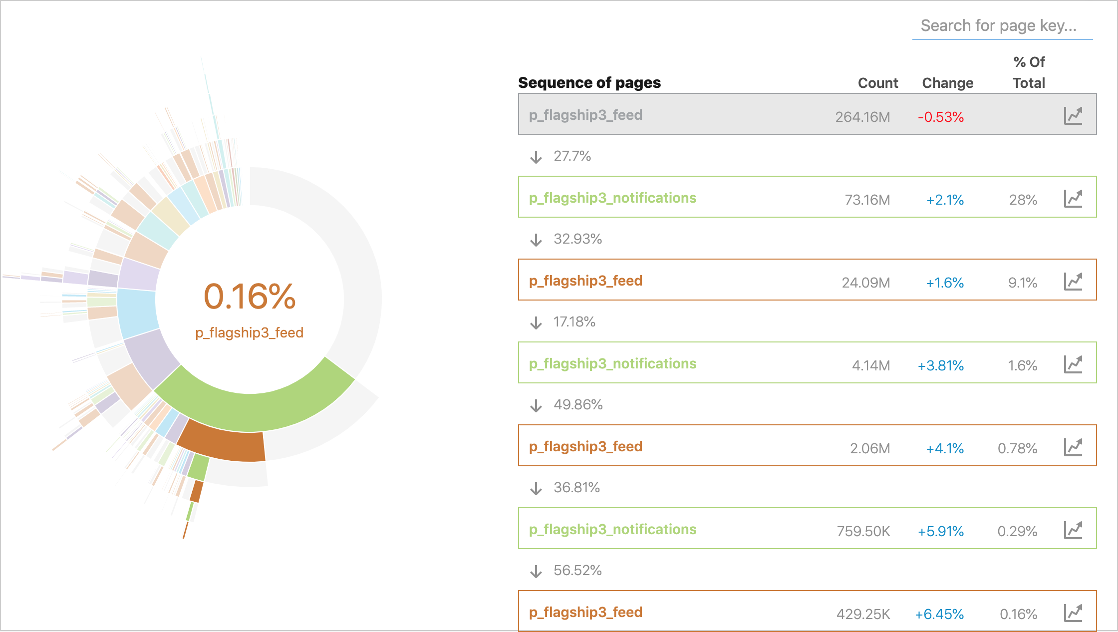 Clarity can show a handful of different metrics for different flows/pagekeys on the site, but one of the more interesting features it has is funnel tracking. The above sunburst chart shows the outbound funnel from feed - that is, “Where do people go next?” This might be useful information to have if you’re trying to gauge the effectiveness of a lix that promotes a certain feature on the feed, or if you’re trying to make smart decisions about selectively pre-fetching data.