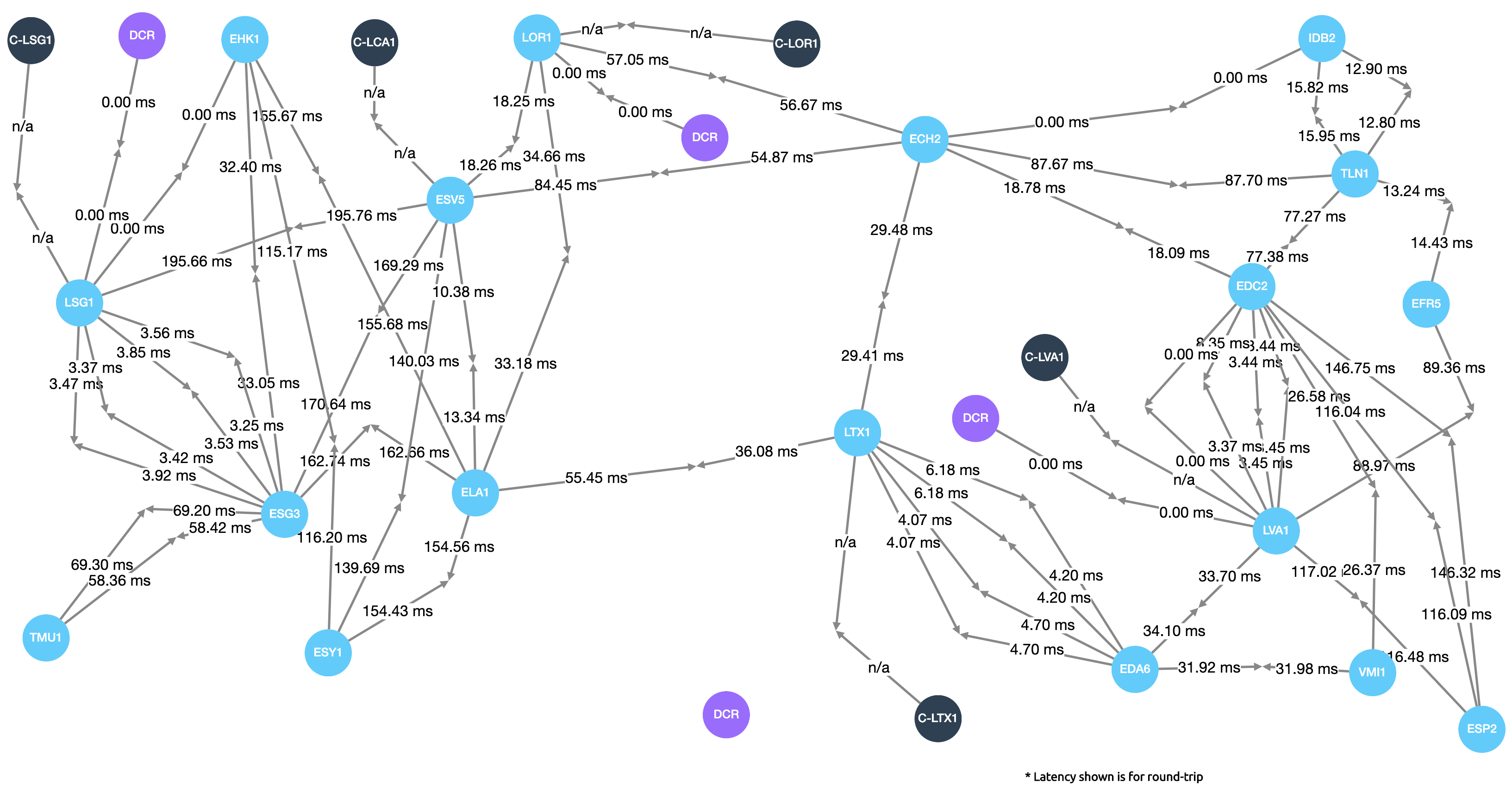 I don’t know exactly what to call this one. A “daddy long-legs high-fiving chart”? Anyhow, this particular…err…DLLHFC (needs more cowbell) shows round- trip latency between our different data centers. I haven’t played with this tool a whole lot, but it also lets you see things like overall traffic, packet loss, and inbound/outbound errors. Pretty cool stuff.