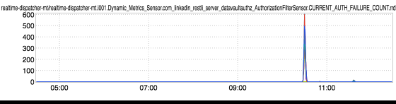 Don’t adjust your dial, folks…these are two different inGraphs of two different metrics. The first is a datavault metric representing the HTTP message count to a service. The second is another Datavault metric representing auth failure counts to that same service. Pretty tight correlation, right? In order to understand what’s going on here, a little bit of background on Datavault. Per the link: