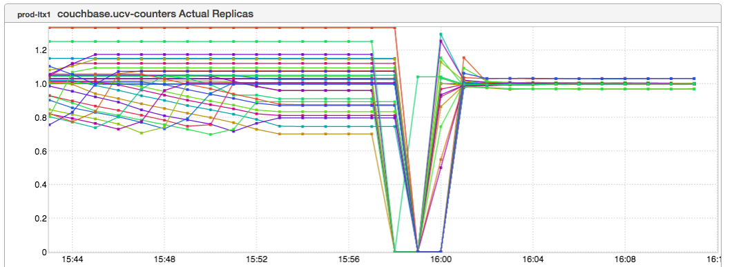 The metric is Couchbase “Actual Replicas”. What that means: Couchbase can be configured to maintain zero or more replicas of data. This can be super- useful if you want to be able to take a node out of rotation and not lose access to data while it’s OOR. This particular cluster is apparently configured to hold one replica. For reasons I don’t entirely understand - I am far from being a Couchbase expert - sometimes replicas can become unevenly distributed. This is undesirable. If you say “I’d like one replica” then you generally want the number of Actual Replicas to converge at one; otherwise if you lose a node with a disproportionate distribution of replica data then you may be in danger of temporarily losing access to data. (I have seen this firsthand, but if someone can explain to me how things can get into this state and why there isn’t automatic recovery over time I’d love to understand it better.)