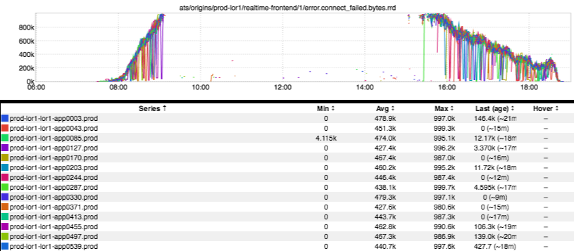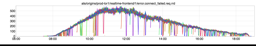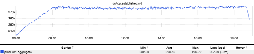 Ah, now there’s a lovely plateau, and it aligns with both of the above two inGraphs. Established connections established remain pegged out at some _ value…but why? Well, after some investigation (and a bit of help from Tom Wiedenbein_ from traffic-sre) we discovered that l1proxy has a per-origin connection limit. This limit was set to 8,000 for realtime-frontend. Multiply that by the number of l1proxy hosts in lor1 (34) and you get 272,000…more or less exactly where the number of established connections flatlines.