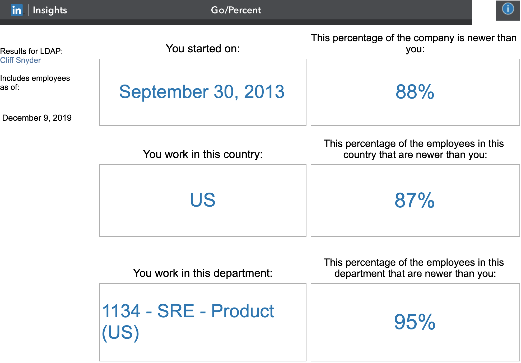 Once upon a time go/percent allowed searching for the results for arbitrary LinkedIn employees, which could be a fun little diversion - a kind of “scavenger hunt” to find the least-/most-tenured employees. Sadly it looks like that capability has been removed; you can only see your own results now. Even so, it’s a fun little tool that may provide a little data for your own personal trip down memory lane.