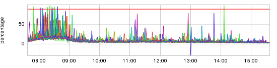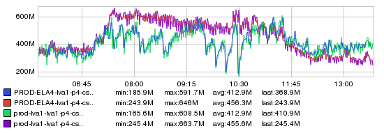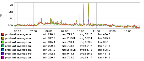 Unfortunately the label cuts the naming off, but if you look at the second and fifth rows in the legend, only those have high ‘max’ values. The different colors are a representation of the 99th percentile latency for cloud-session hosts across each network core/cage of the LVA1 production fabric. The particular core in question is ‘P4’ which is in Cage C.