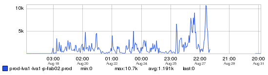 As documented here in NEO-22980 the interface on lva1-p-fab02 had a large amount of errors. Having a look at the graphs, we can see that this had been happening since the 18th of August.