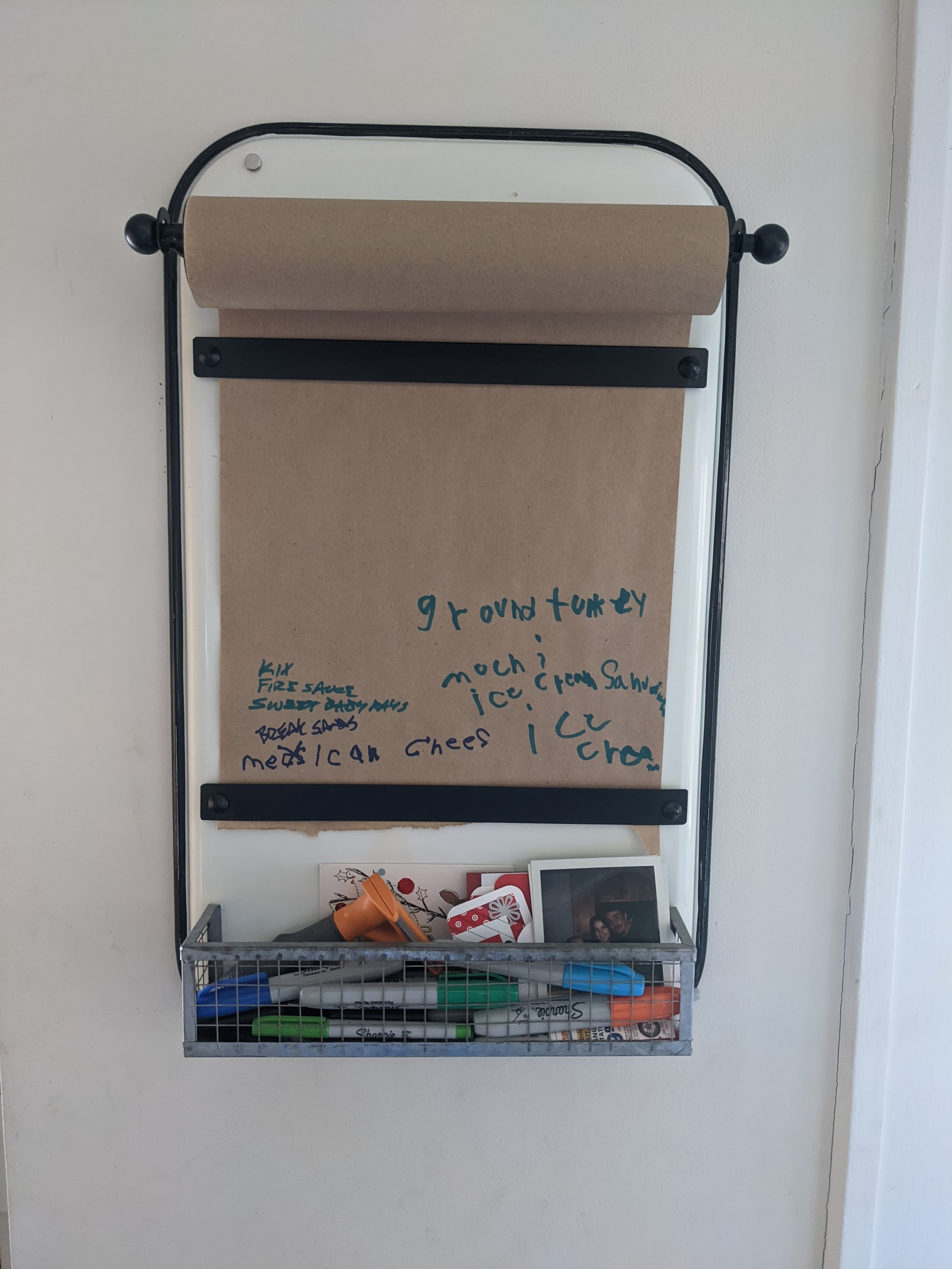 What do you do when you only have, say, a dozen things on there come time to go to the grocery? Rip the whole thing off? That’s kind of a waste. Just cross off items after they’re transferred to something more portable that I can carry around the grocery store? Sure, but now you’ve kinda got a bin-packing problem - I mean, what do you do if the page fills up before your next trip? (Man I wish I had an alternative pic with “toothpaste” scrawled vertically in the margins in 4-point font…)
