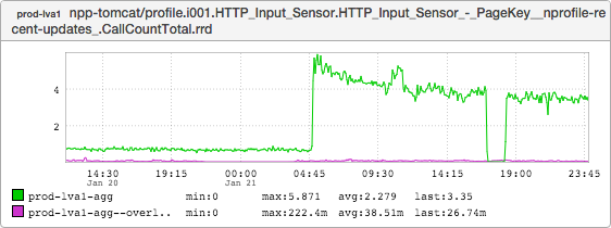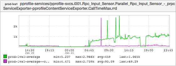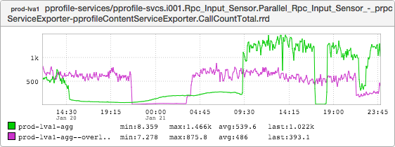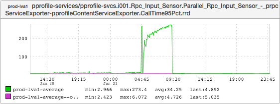 This graph represents the maximum latency for calls to pprofile-services. Note that it didn’t budge when the lix was terminated at 09:30, either.