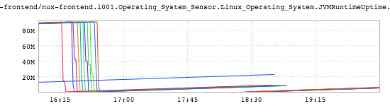This is an uptime graph. It’s worth spending some time to unpack what’s going on here. The dropoff around 16:15 is a canary promotion. It looks about like what one might expect - uptime drops off sequentially as the deploy rolls through each node and then starts moving up-and-to-the-right. Note the blue - that’s the canary, which just keeps on chugging along since it’s already at the desired version. Then - just before 18:30 - some new nodes appear. …and then just after 18:30 the original nodes drop off. (The lines are tight so it’s hard to see that, but trust me…that’s what happened.) None of this looks too bad thus far. Well, let’s take a look at this: