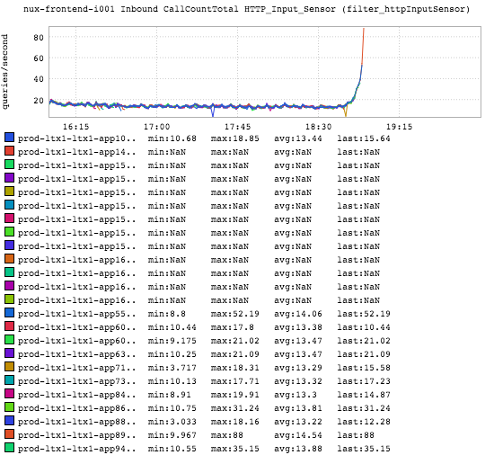 This is a graph of per-node QPS in the same timeframe for the same service. I included the legend with this one to demonstrate where the badness actually occurred. I’d like to draw your attention to the NaNs. The new nodes that were added never actually took any traffic. The hockey stick? That occurred due to nodes dropping out of rotation and the remaining nodes picking up the queries for the service, until there was only a single node taking all queries (until it eventually came down).