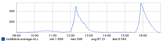 So the real reason for the spikes is that during deployment when the service is restarted the sensors get reset and once again stop emitting until initialized. In other words, those peaks are actually approaching the real average service latency (which IIRC leveled off in the neighborhood of 600ms at higher QPS).