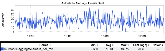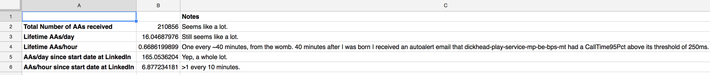 Huh. Over 200K alerts since I started at LinkedIn. I dumped some numbers into a spreadsheet to take a look at some averages:
