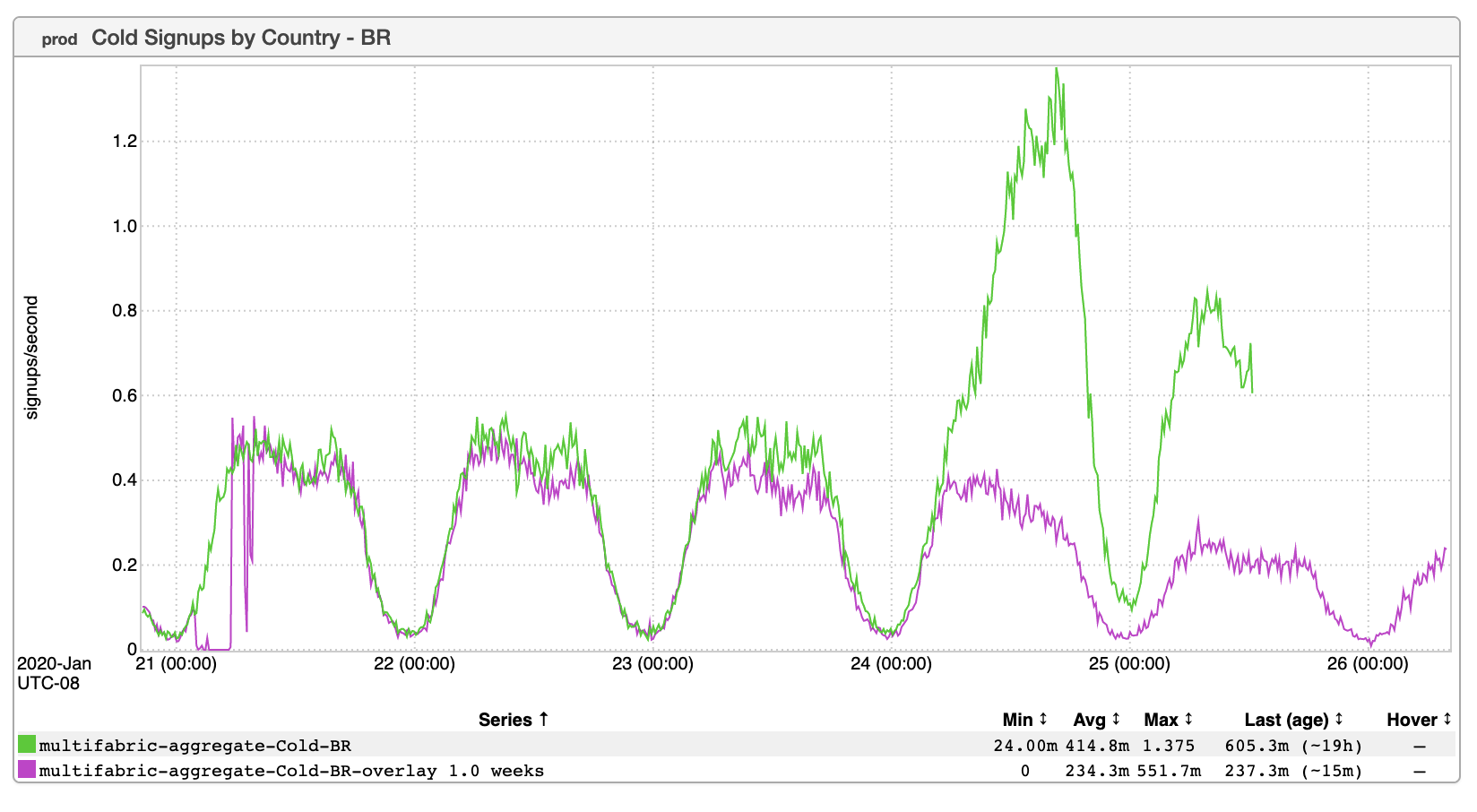 Around the time I started at LinkedIn (September 2013) Conan O’Brien decided that he was going to conquer LinkedIn. This resulted in some consternation on our end as metrics like cold signups and connection requests suddenly showed unexpected spikes. I couldn’t find a GCN for this event (although I did find an old ticket for Conan’s subsequent first post as an Influencer) and I don’t have any inGraphs for it, but I reckon the metrics probably looked a little like the following: