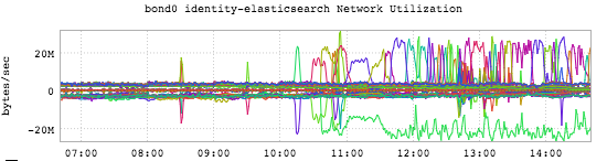IIRC Rylee Fowler sent me this one a while back. It’s been long enough that I don’t recall the specific circumstances, but I think what was going on is that an elasticsearch node was being removed from rotation and distributing all of its indices to other nodes. (Note the singleton outbound metric - the green squiggly along the bottom - mirrors the multicolored inbound squigglies along the top.) If I’m not misremembering this one, it was actually expected behavior.