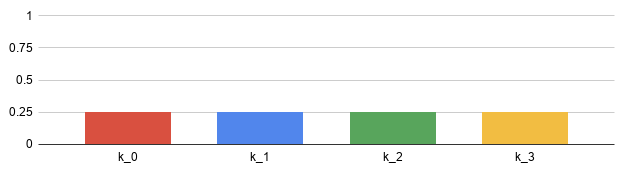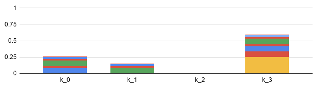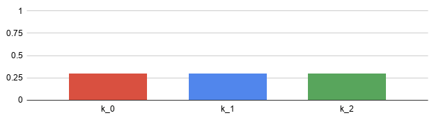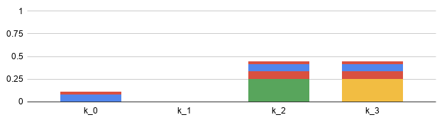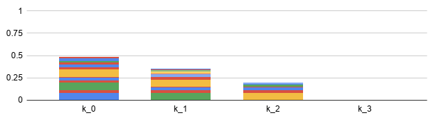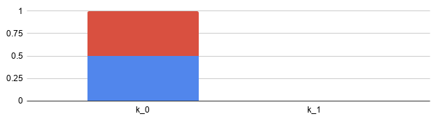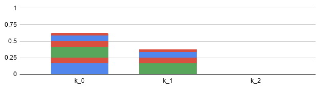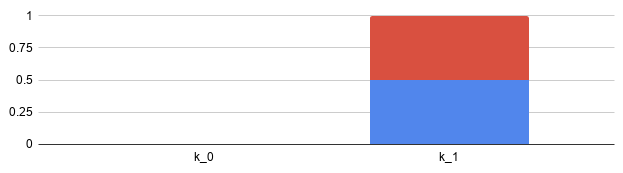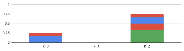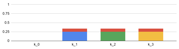 Next, we shut off k, diving its load evenly. At T=2, the first tranche k ends up with 1/4 of the load, while the third tranche k ends up carrying 3/4 of the 102 load: