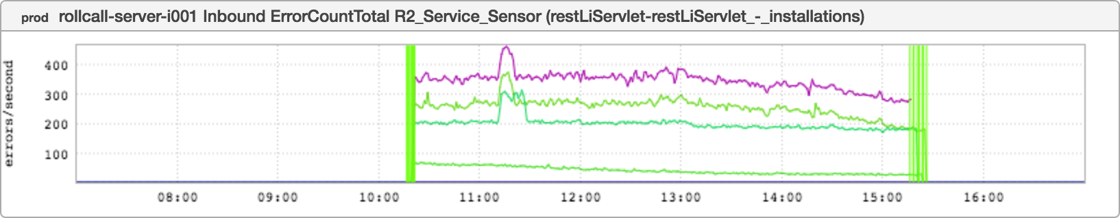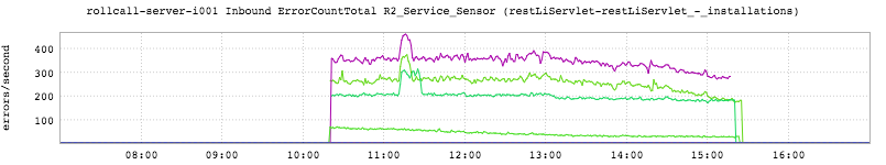 This inGraph shows errors/second for the rollcall service. Notice that There. Are. Four. Lines. That’s because we have four production fabrics, and when we canary we deploy the new code to one node per fabric. (Worth noting: we also deploy one per container and one per instance. In the common case - as above - there is one container and one instance). It was broken for around 5 hours, which to be frank is a little longer than I’d like to see but it’s still preferable to breaking everything all in one go.
