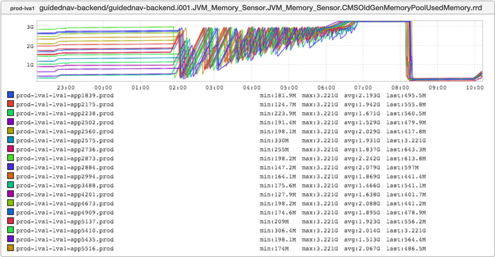 _This week’s igotw comes from an incident that Kathleen Shannon and I looked at a while back. One of the services Katie supports - _guidednav-backend - had been running for months without incident, and then all of a sudden just up and fell over. She bounced it and it came back up, but we were curious: What the devil had happened? While we were poking around through metrics this graph jumped out: