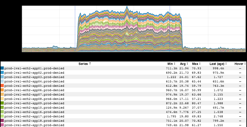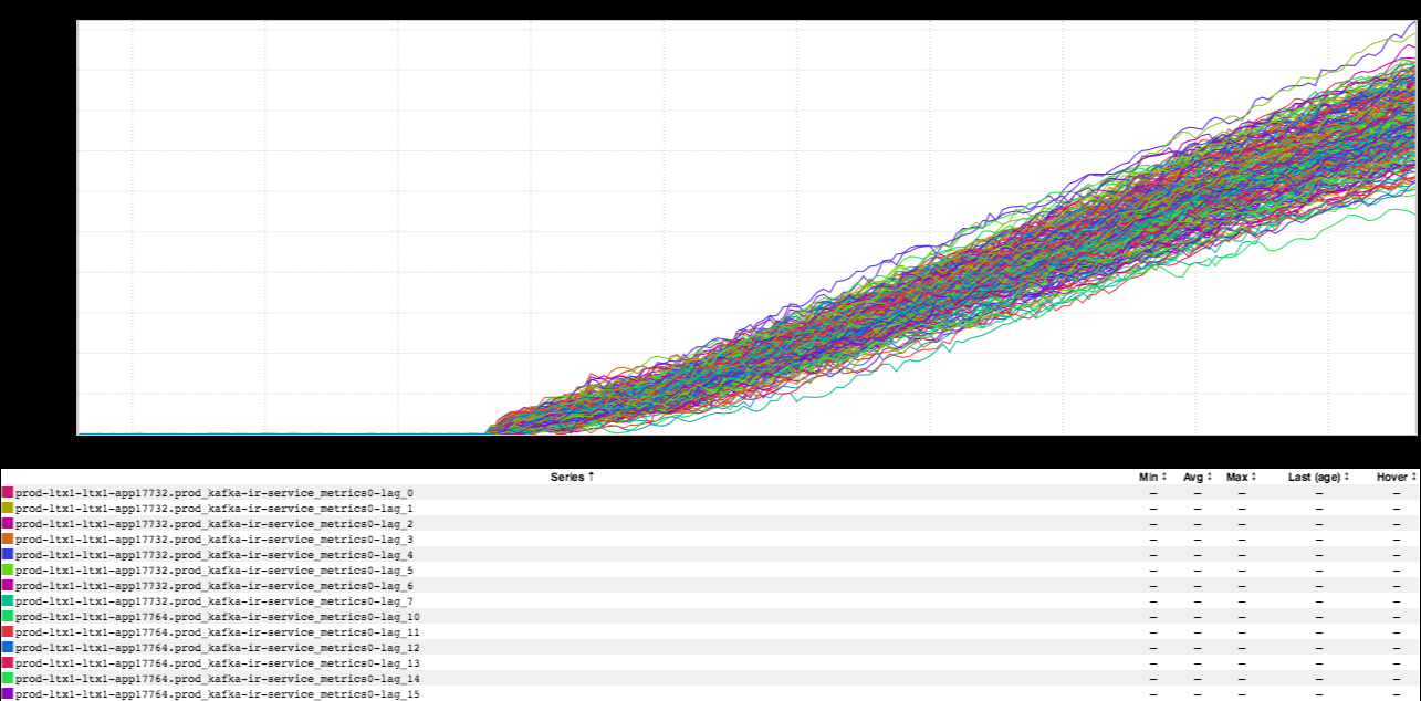 Following that, we’ve got a variation on your standard “kafka lag rainbow” (originally pointed out to me by Ryan Doherty). We’ve got two different perspectives. Here’s what it looked like when the Rainbow Cannon originally started firing:
