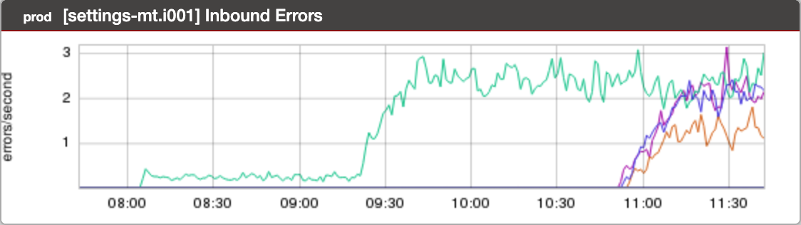 This didn’t actually come from today’s DS3 dashboard; it’s one that I saved off last September (and promptly forgot about). I decided to throw it in because it reminded me of the very first igotw post. It tells a very similar story. Busted canary is deployed (in one fabric) just after 08:00, busted canary is promoted (in one fabric) just before 09:30…and then gets promoted in the remaining fabrics just before 11:00.