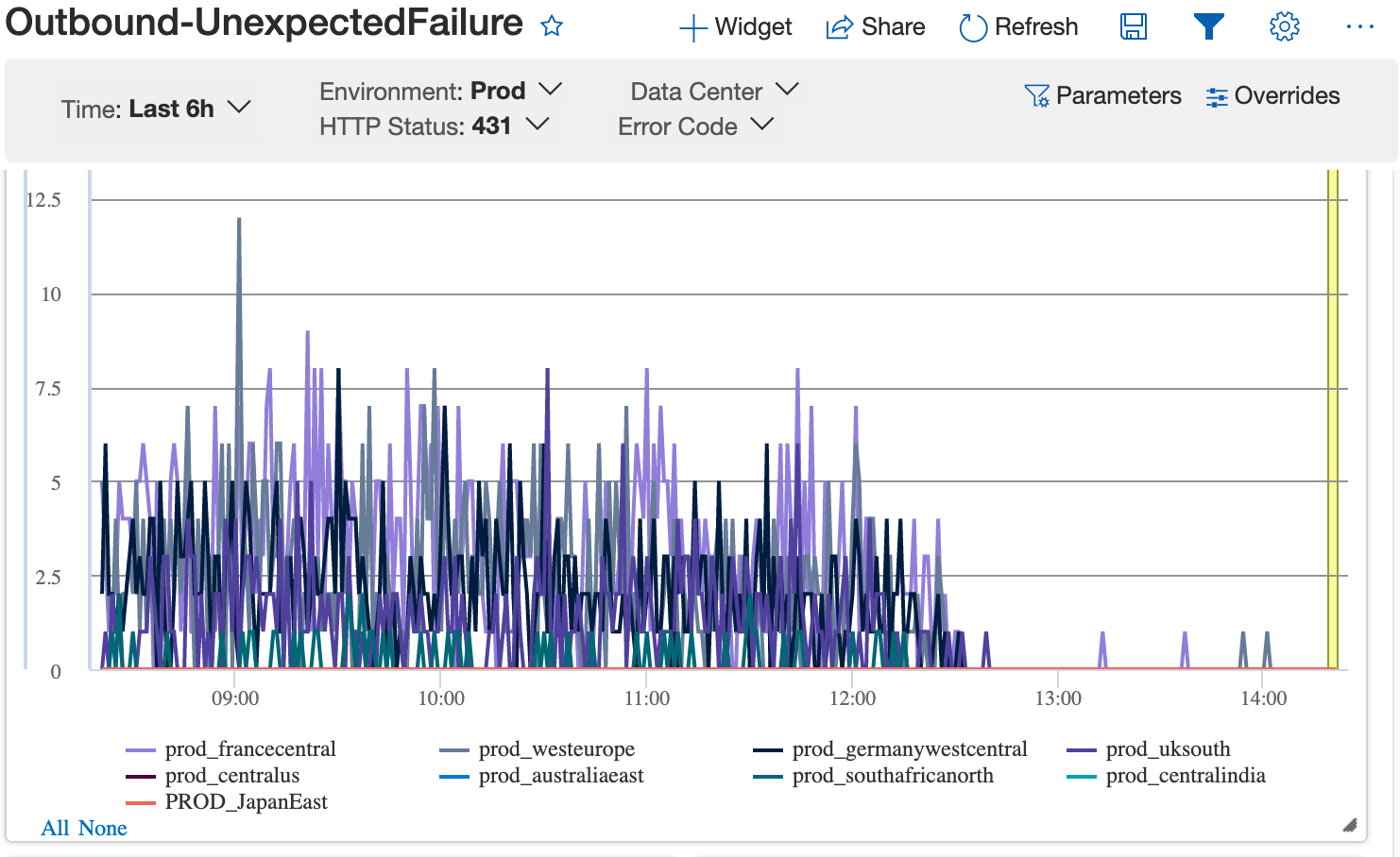 It comes from Microsoft’s Geneva monitoring platform, and it depicts 431 “Request Header Fields Too Large” response codes being returned to the client. In this particular case, some percentage of requests were being sent with 8193 bytes of header data, and the jetty limit for request headers was set to…8192 bytes, which looked like this in our logs: