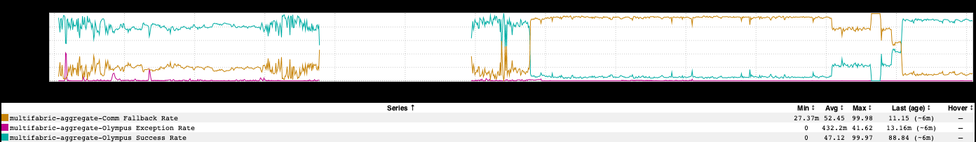 The approach being used in this case is simply to compare the results from the new and old endpoints. If the results match, emit a “Success” metric. If they don’t match, emit a “Fallback” metric and fall back to using the results from the old endpoint (in this case, “Comm”). Oh, and if it blows up entirely emit an Exception metric (smart). …and then wrap all that up in an RPN that shows a nice percentage.